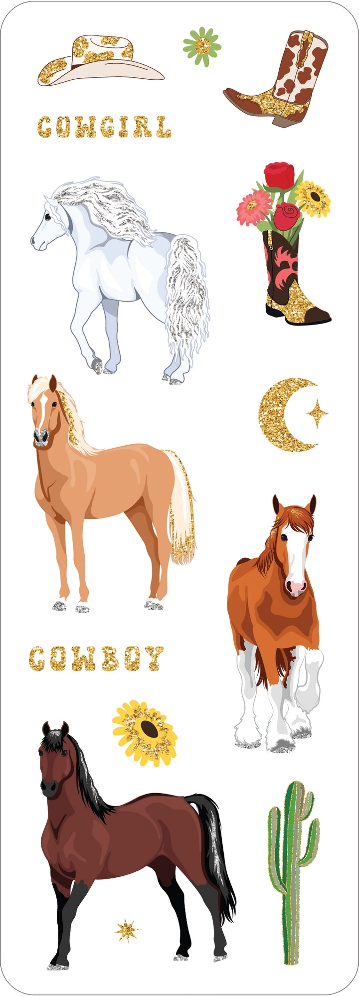This equine-themed set will gallop into your heart with more than 70 stickers! The vibrant stickers depict a variety of horses, such as the spotted Appaloosa, the beautiful Palomino, and more, plus fun accent stickers, like cowboy hats, boots, cacti, horseshoes, and cheerful phrases like ''Howdy,'' ''Cowboy,'' and ''Cowgirl.''