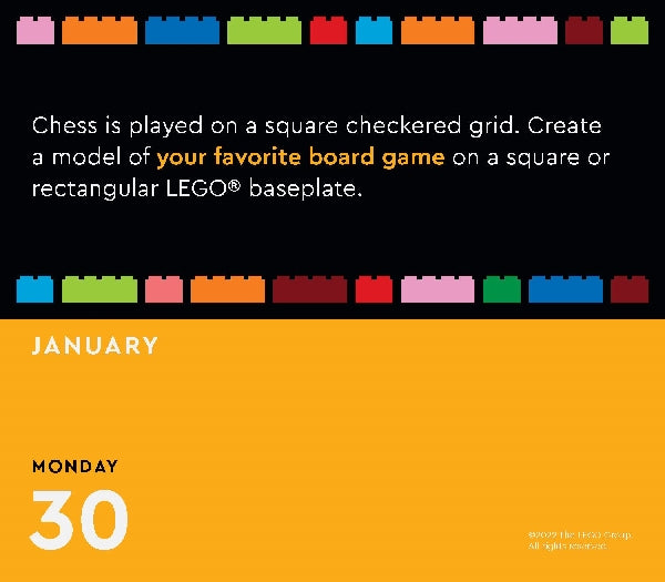 This unique tear-off desk calendar will inspire LEGO fans to activate their imaginations, and their bricks, with inspiration for a new build every day of the year! The full-color pages offer building prompts and ideas that range from easy to hard, silly to seasonal and require no new sets-you can use the LEGO bricks you already own!