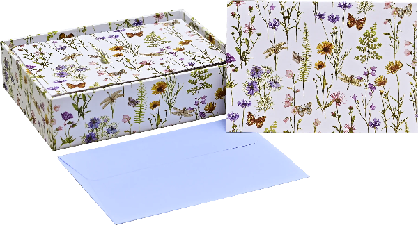 Softly hued butterflies, dragonflies, ferns, and flowers are combined with shimmering gold foil embellishments and a fresh, matte-white background on these elegant note cards.