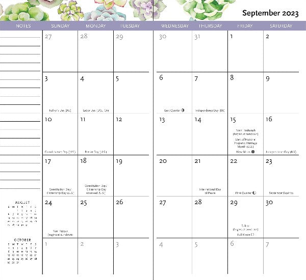 • Each spread features 1 month, past and future month calendar references, and ruled notes spaces.