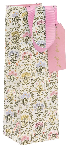 Delight in timeless elegance with this Scaloppina Floral Bottle Gift Bag. Featuring a delicate pastel floral pattern with gold foil accents, it’s the perfect way to present wine, champagne, or specialty spirits. Finished with soft pink ribbon handles and a matching tag for a touch of charm.