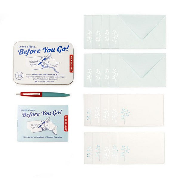 Show your gratitude in a personal way with this portable thank you note kit. Includes 10 cards, 10 envelopes, a ballpoint pen and "Note Writer's Guidebook".
