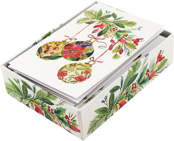 A trio of ornaments -- with poinsettia, holly, and floral motifs -- are fastened to the branch of a Christmas tree with red ribbons on this charming card.
