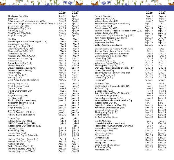 • Includes a page to note birthdays, anniversaries, and other dates to remember.
