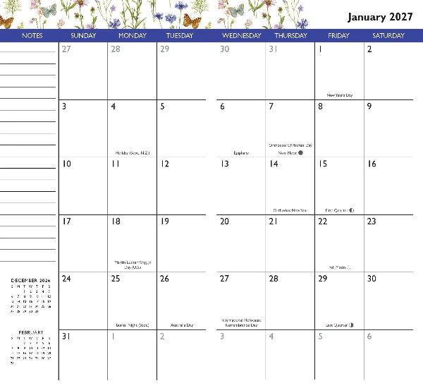 • Each spread features 1 month, past and future month calendar references, and ruled notes spaces.