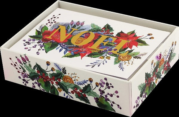 The word ''NOEL'' is stamped in gold foil and surrounded by poinsettias, sprigs of holly, berries, and other festive florals on these lovely little greeting cards.