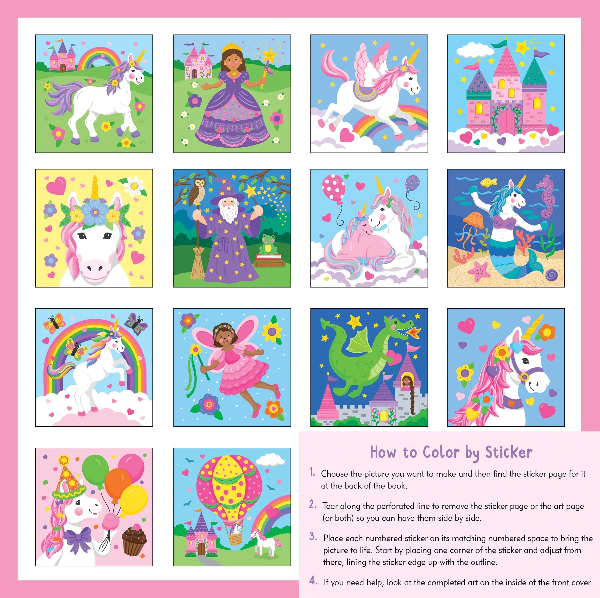 My First Color-by-Sticker Unicorns & More is perfect for young children who love sticker art! This sticker activity book comes with 14 magical scenes to ''color'' with the stickers provided.