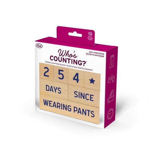 Who’s Counting is a set of parenting milestone blocks so you can count the days, minutes, hours, and weeks filled with the joys of parenting. Each edition includes 7 beechwood blocks to help you keep tabs on life with kids