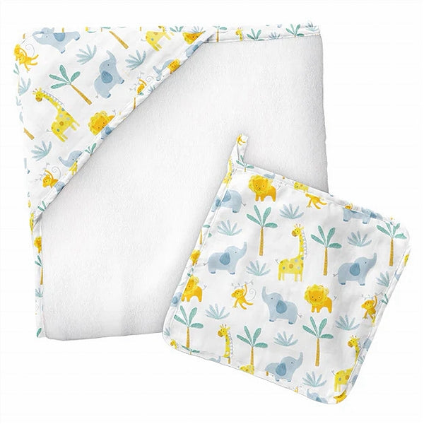 This muslin towel washcloth set is the perfect addition to bath time! Made of 70% bamboo and 30% cotton, this set features an adorable zoo design and comes in a giftable box. Keep your little one clean and cozy from head to toe. Ideal for baby showers, birthdays, and more!
